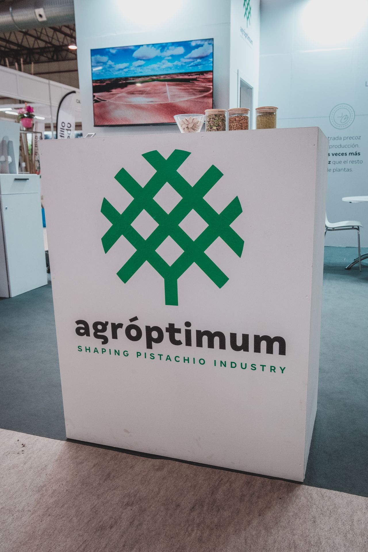 La identidad visual de Agróptimum, basada en tonos verdes y blancos, se integró en toda la arquitectura del stand para reforzar su posicionamiento como empresa innovadora en el sector agrícola.