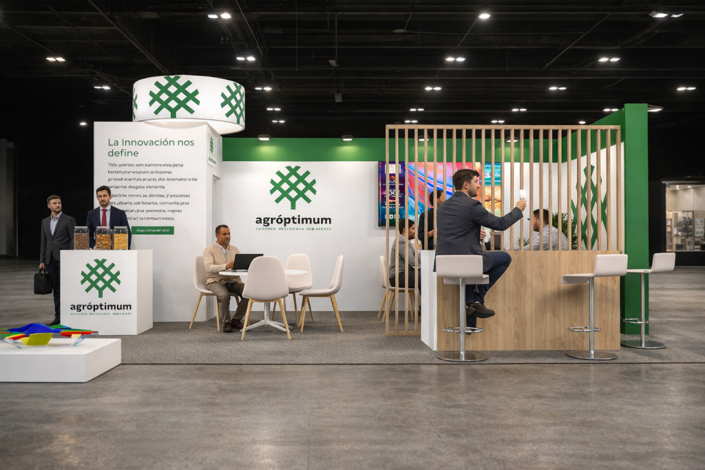 Participar en este evento exige espacios expositivos capaces de comunicar tecnología, confianza y liderazgo, algo que el stand de Agróptimum consigue mediante un diseño claro, abierto y altamente reconocible.
