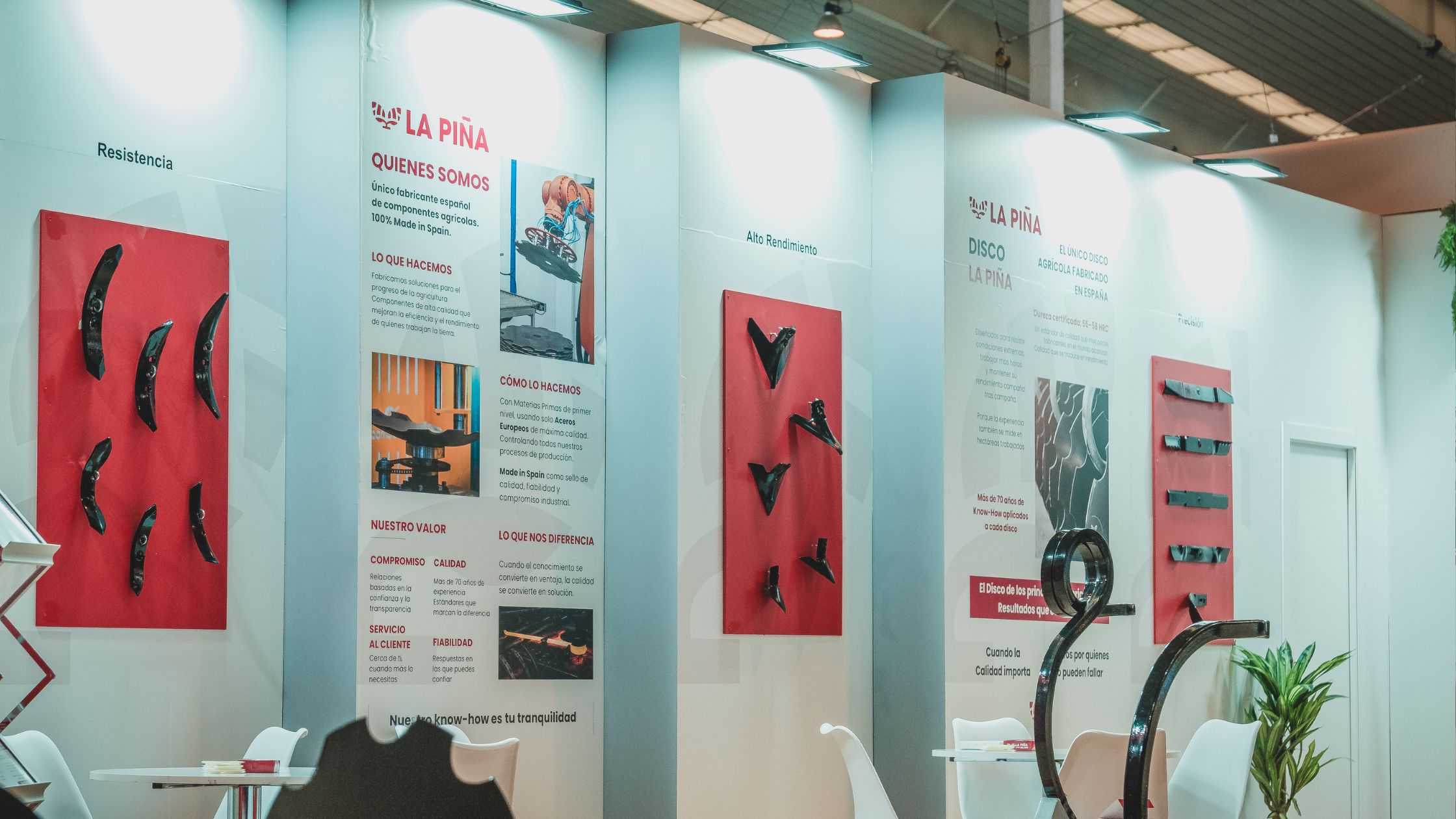 Agricultural components — discs and technical elements — were not simply displayed. They were integrated into the design language of the stand:
